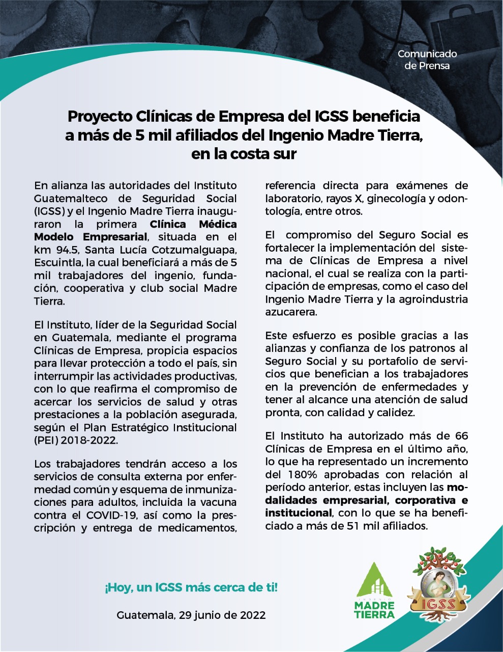 Comunicado. Proyecto Clínicas de Empresa del IGSS beneficia a más de 5 mil afiliados del Ingenio Madre Tierra, en la costa sur
