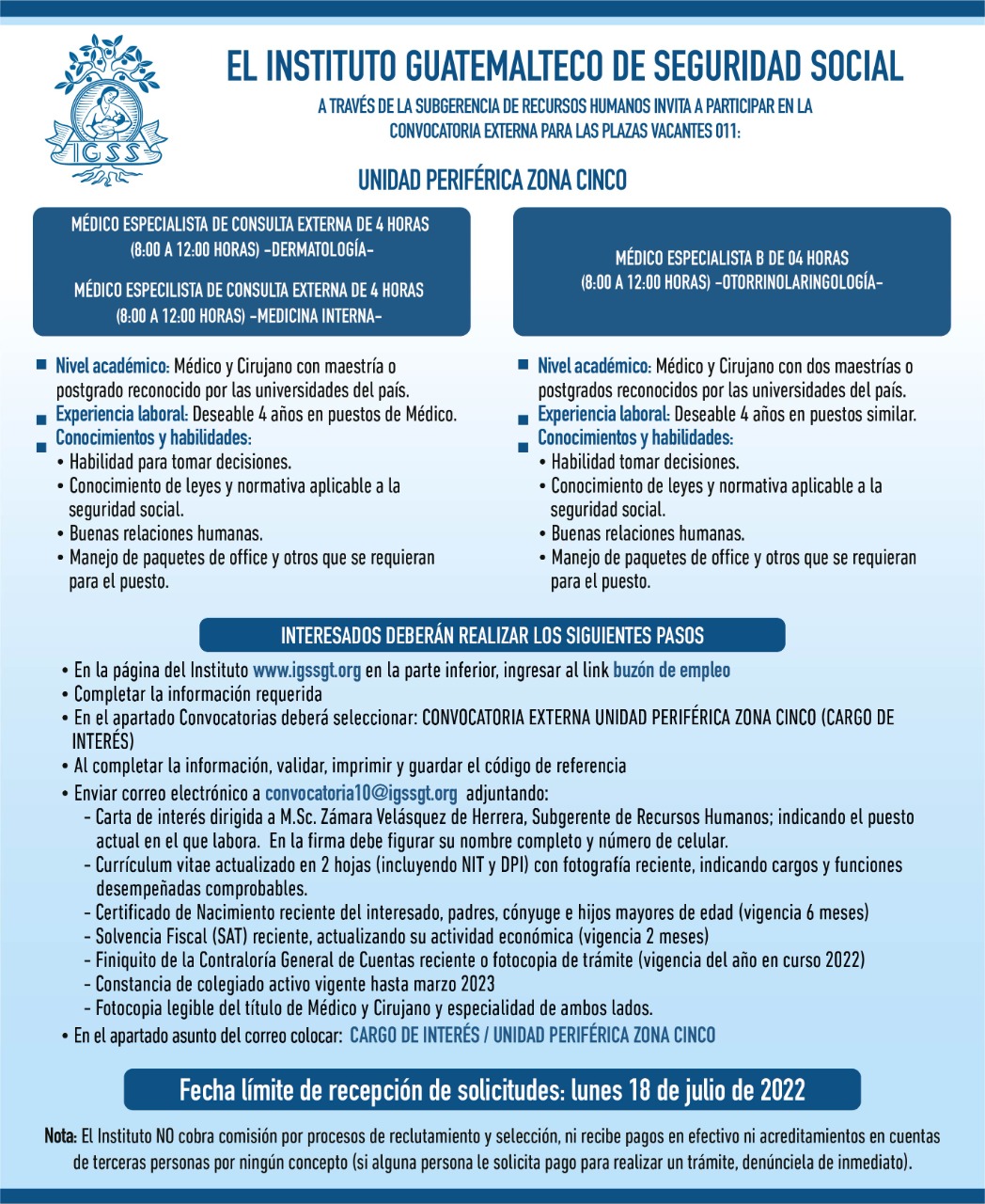 El IGSS invita a participar en la convocatoria de la plaza: Médico Especialista de Consulta Externa y Médico Especialista B 8 julio, 2022 TwitterWhatsAppLinkedin Convocatoria externa para plaza vacante 011 para la Unidad Periférica zona 5 Fecha límite de recepción de solicitudes: 18 de julio de 2022