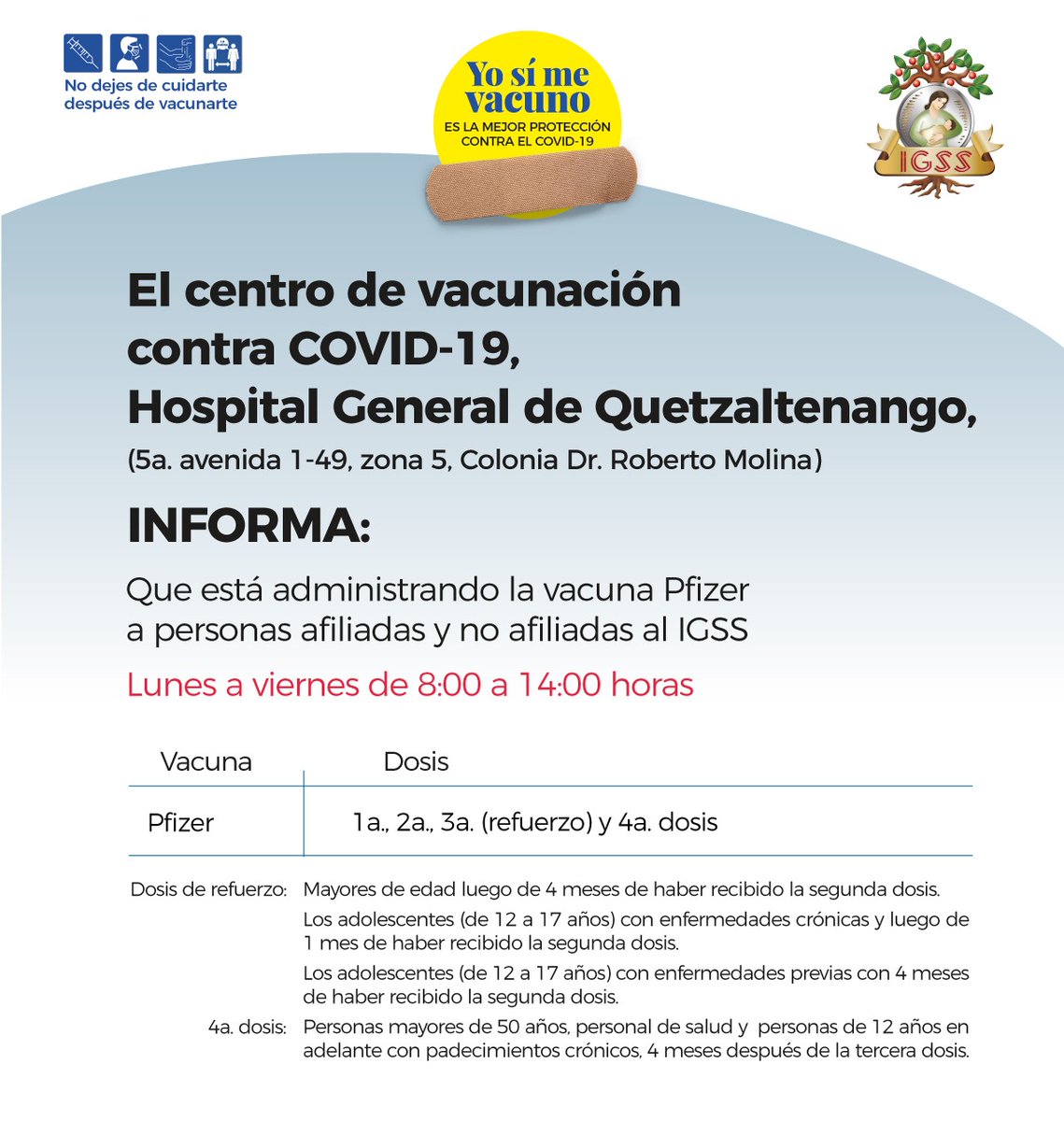 Aviso. El centro de vacunación contra COVID-19, Hospital General de Quetzaltenango, INFORMA: 12 julio, 2022 TwitterWhatsAppLinkedin Se estará administrando la vacuna Pfizer a personas afiliadas y no afiliadas al IGSS. Lunes a viernes de 8:00 a 14:00 horas 1a., 2a., refuerzo y 4a. dosis