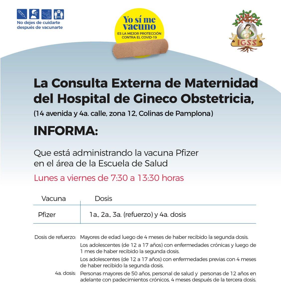 Aviso. La Consulta Externa de Maternidad del Hospital de Gineco Obstetricia, INFORMA: 13 julio, 2022 TwitterWhatsAppLinkedin Estará vacunando a personas afiliadas o no al Seguro Social con la vacuna Pfizer. Disponibilidad: Lunes a viernes de 7:30 a 13:30 horas 1a., 2a., refuerzo y 4a. dosis