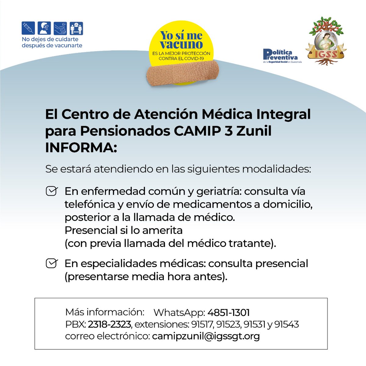 Aviso. El Centro de Atención Medica Integral para Pensionados CAMIP 3 Zunil INFORMA: