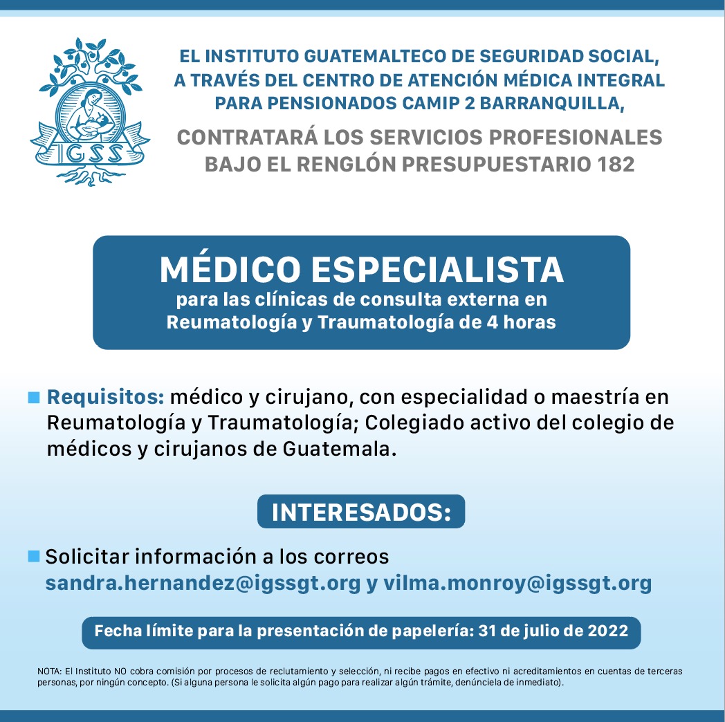 El IGSS invita a participar en la convocatoria de la plaza: Médico Especialista