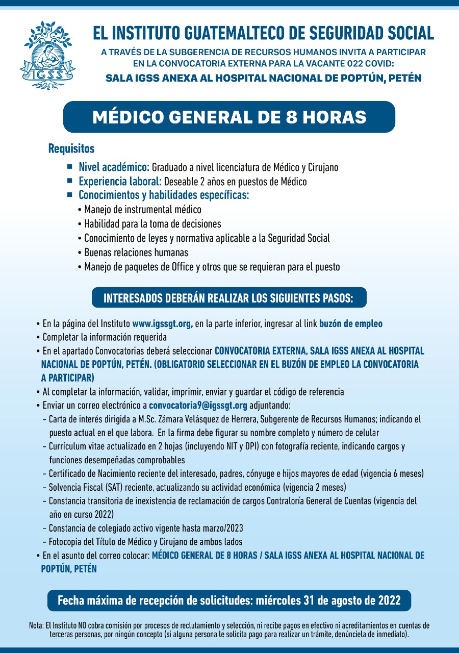 El IGSS invita a participar en la convocatoria de la plaza: Médico General de 8 horas 25 agosto, 2022 TwitterWhatsAppLinkedin Para sala IGSS anexa al Hospital Nacional de Poptún, Petén Fecha límite de recepción de solicitudes: 31 de agosto de 2022