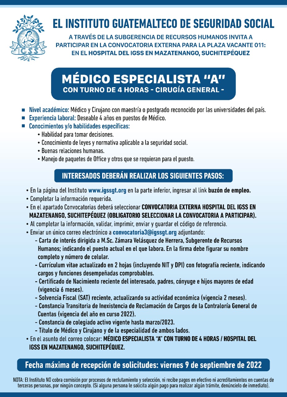 El IGSS invita a participar en la convocatoria de la plaza: Médico Especialista “A” con turno de 4 horas, Cirugía General 30 agosto, 2022 TwitterWhatsAppLinkedin Para el Hospital del IGSS en Mazatenango, Suchitepéquez Fecha límite de recepción de solicitudes: 9 de septiembre de 2022