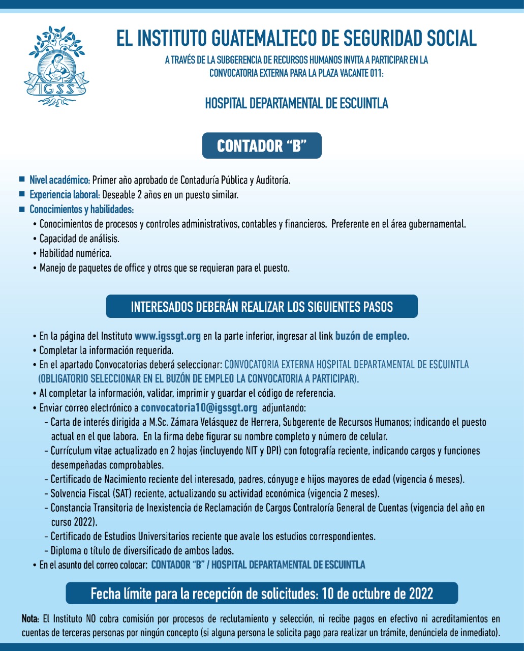El IGSS invita a participar en la convocatoria de la plaza: Contador B 30 septiembre, 2022 TwitterWhatsAppLinkedin Para el Hospital Departamental de Escuintla Fecha límite de recepción de solicitudes: 10 de octubre de 2022