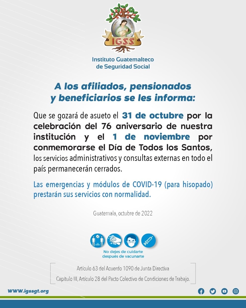 Aviso. A los afiliados, pensionados y beneficiarios se les informa: 26 octubre, 2022 TwitterWhatsAppLinkedin Que se gozará de asueto el 31 de octubre por la celebración del 76 aniversario de nuestra institución y el 1 de noviembre por conmemorarse el Día de Todos los Santos.