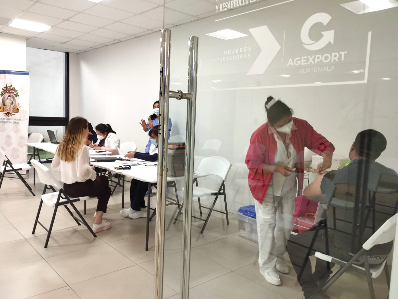 El Hospital de Gineco Obstetricia realizó una brigada de vacunación contra el Covid 19, en las instalaciones de la Asociación Guatemalteca de Exportadores, Agexport, ubicada en la zona 13 de la capital.
