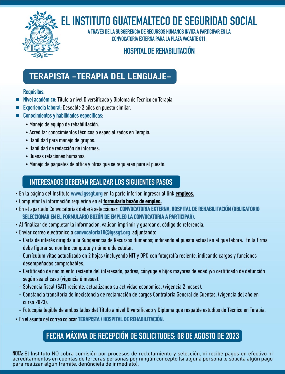Convocatoria para la plaza: Terapista (Terapia del Lenguaje) en el Hospital de Rehabilitación 26 julio, 2023 TwitterWhatsAppLinkedin Puesto: Terapista (Terapia del Lenguaje) Unidad: Hospital de Rehabilitación Fecha límite de recepción de solicitudes: 08 de agosto de 2023