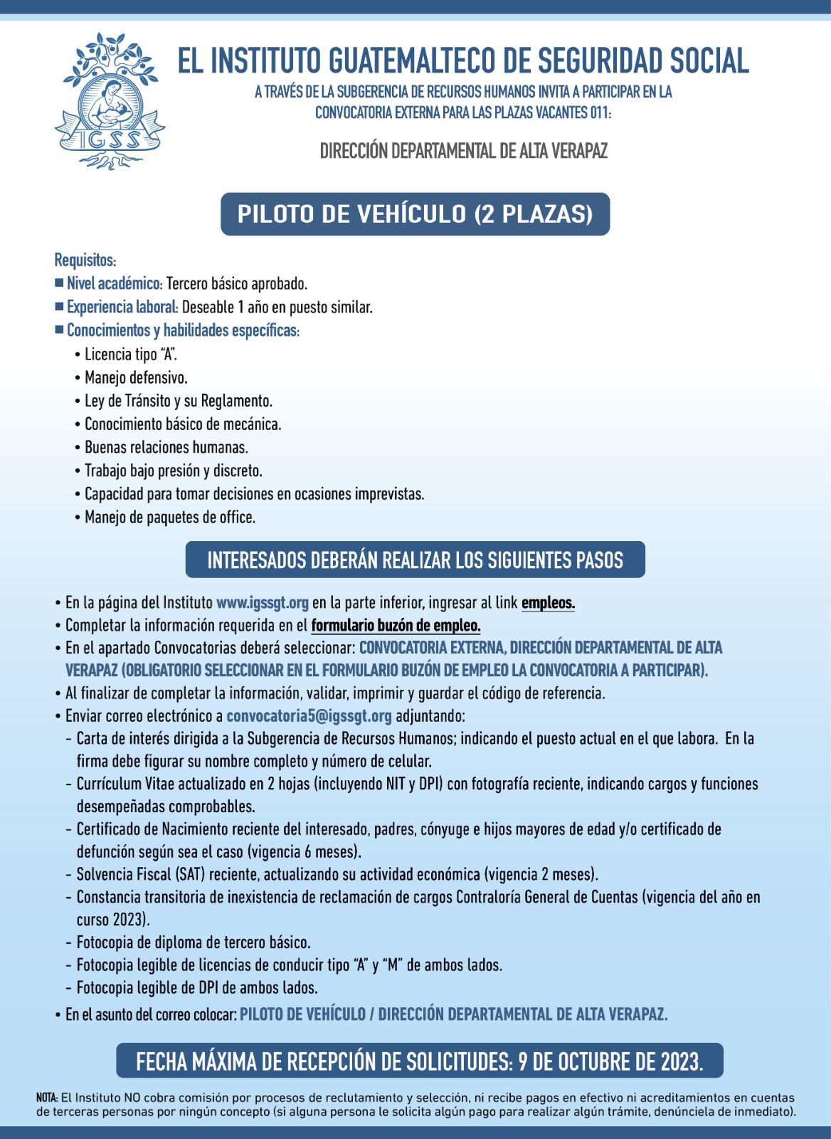 Convocatoria de la plaza: Piloto de Vehículo (2 plazas) para la Dirección Departamental de Alta Verapaz 29 septiembre, 2023 TwitterWhatsAppLinkedin Puesto: Piloto de Vehículo (2 plazas)Unidad: Hospital General de EnfermedadesFecha límite de recepción de solicitudes: 09 de octubre de 2023