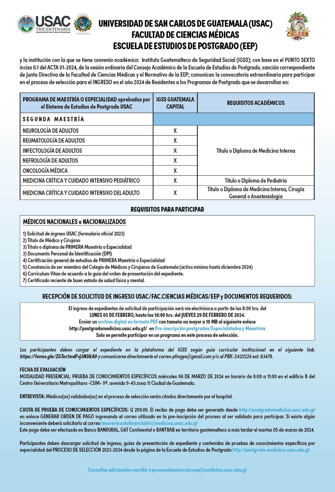 La Universidad de San Carlos de Guatemala (USAC), la Facultad de Ciencias Médicas, la Escuela de Estudios de Postgrado (EEP) y el Instituto Guatemalteco de Seguridad Social, comunican la convocatoria extraordinaria para participar en el proceso de selección para el ingreso en el año 2024 de residentes a los Programas de Postgrado.