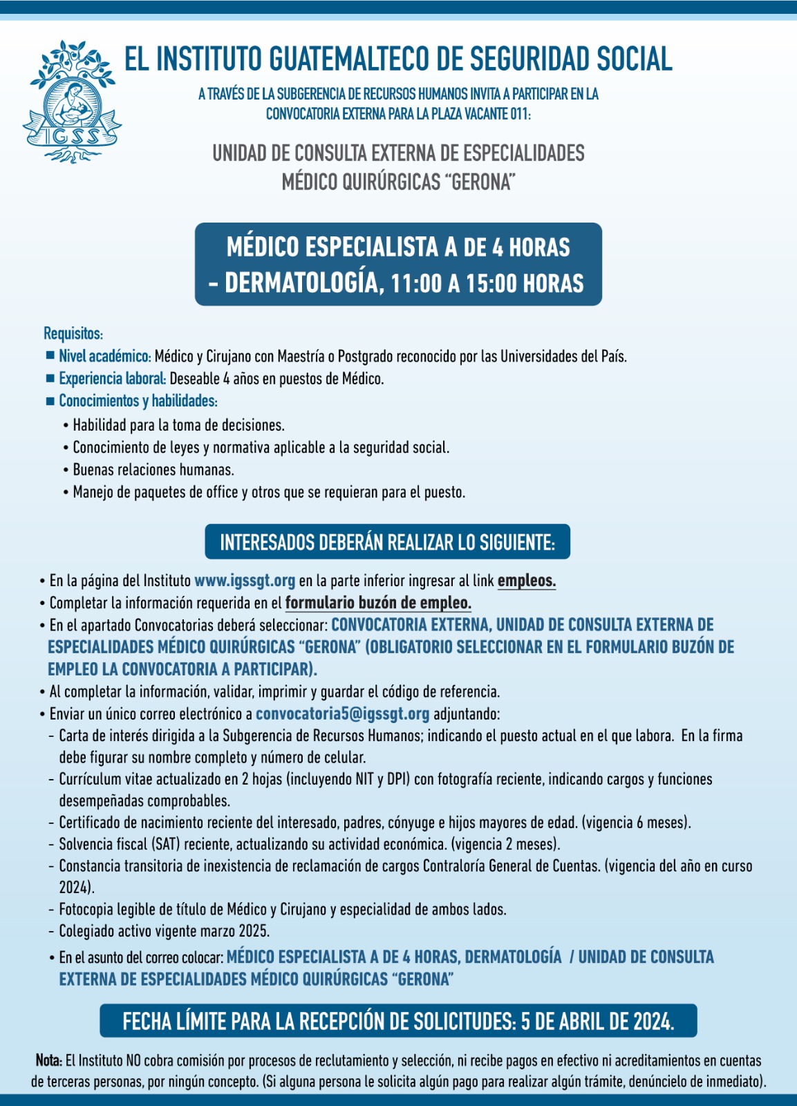 Puesto: Médico Especialista A de 4 horas (11:00 a 15:00 Hrs.) Dermatología Ubicación: Unidad de Consulta Externa de Especialidades Médico Quirúrgico Gerona Fecha límite de recepción de solicitudes: 05 de abril de 2024