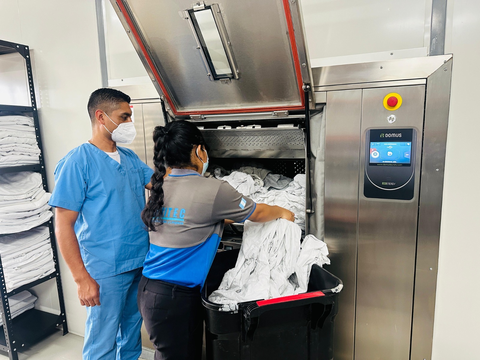 Este servicio funciona en tres estaciones: una donde llegan las prendas contaminadas y suciedad liviana, otra donde sale la ropa limpia y pasan al proceso de secado y por último donde el personal plancha y dobla tanto las batas ortopédicas, sábanas, ponchos, campos, pantalones y camisas de pacientes, filipinas médicas por mencionar algunos. Posteriormente, en el área de ropería se tiene el inventario total de estos insumos que se mantienen abastecidos para la demanda en los módulos.