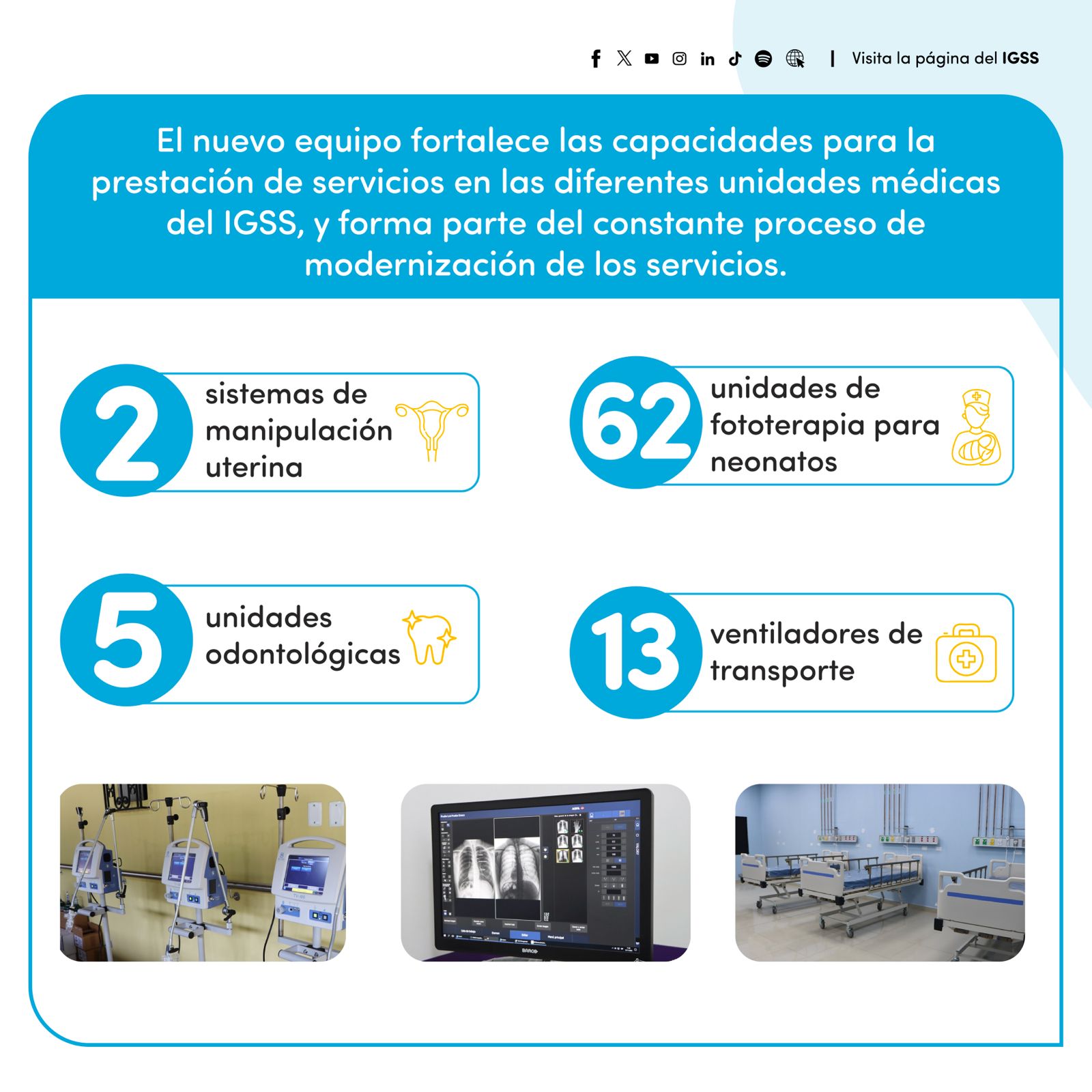 De la mano de la transformación digital el Seguro Social mantiene un constante proceso de modernización para facilitar la atención para todos los derechohabientes. De esa cuenta, el año pasado se adquirieron 626 unidades de equipos para 12 unidades médico-hospitalarias.