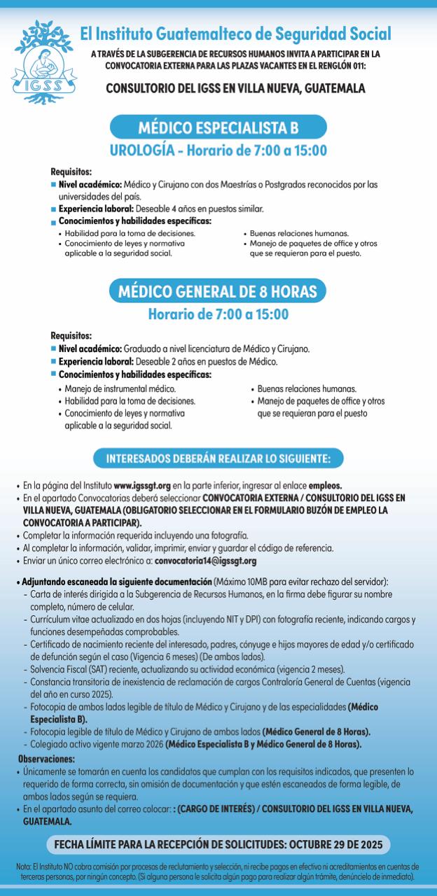 El Instituto Guatemalteco de Seguridad Social a través de la Subgerencia de Recursos Humanos invita a participar en la convocatoria externa para las plazas vacantes 011: