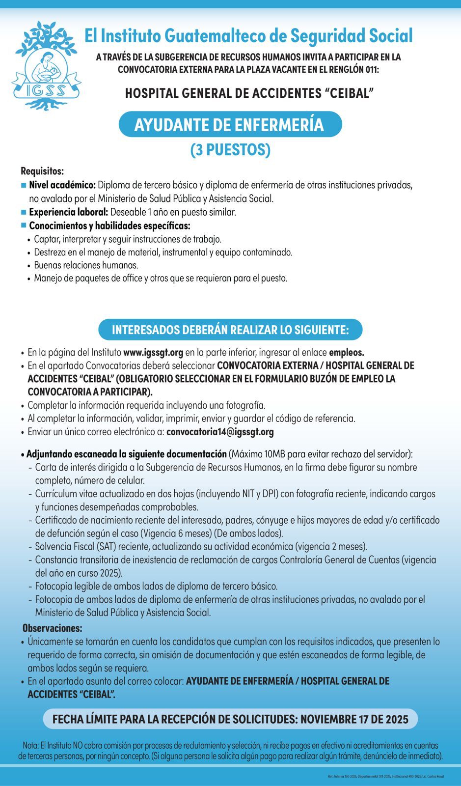 El Instituto Guatemalteco de Seguridad Social a través de la Subgerencia de Recursos Humanos invita a participar en la convocatoria externa para la plaza vacante 011: