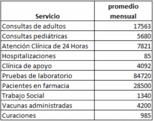 En ambas instalaciones se cuenta con los servicios de médicos generales, médicos especialistas, trabajadoras sociales, enfermería, educación para la salud, Farmacia, servicios contratados, Laboratorio Clínico, secretaría, Registros Médicos, signos vitales, servicios de apoyo, así como la estructura administrativa para el respectivo funcionamiento.
