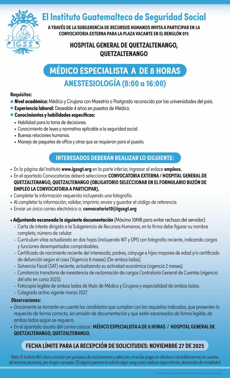 El Instituto Guatemalteco de Seguridad Social a través de la Subgerencia de Recursos Humanos invita a participar en la convocatoria externa para la plaza vacante 011: