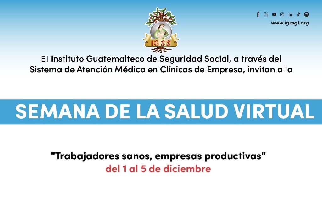 Inicio Clínicas de Empresa Semana de la Salud Virtual 2025 Semana de la Salud Virtual 2025 18 noviembre, 2025 TwitterWhatsAppLinkedin «Trabajadores sanos, empresas productivas» Del 1 al 5 de diciembre de 2025 Evento dirigido a las empresas e instituciones afiliadas al Sistema de Atención Médica en Clínicas de Empresa Artículos relacionadosMás del autor IGSS y High Q International impulsan la salud laboral con la inauguración de una Clínica Modelo Empresarial en Zacapa El IGSS y Banco Industrial unen fuerzas para acercar la salud a los trabajadores IGSS y USAC inauguran la primera Semana de la Seguridad Social