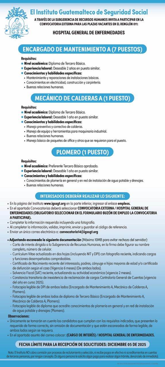 El Instituto Guatemalteco de Seguridad Social a través de la Subgerencia de Recursos Humanos invita a participar en la convocatoria externa para la plaza vacante 011: