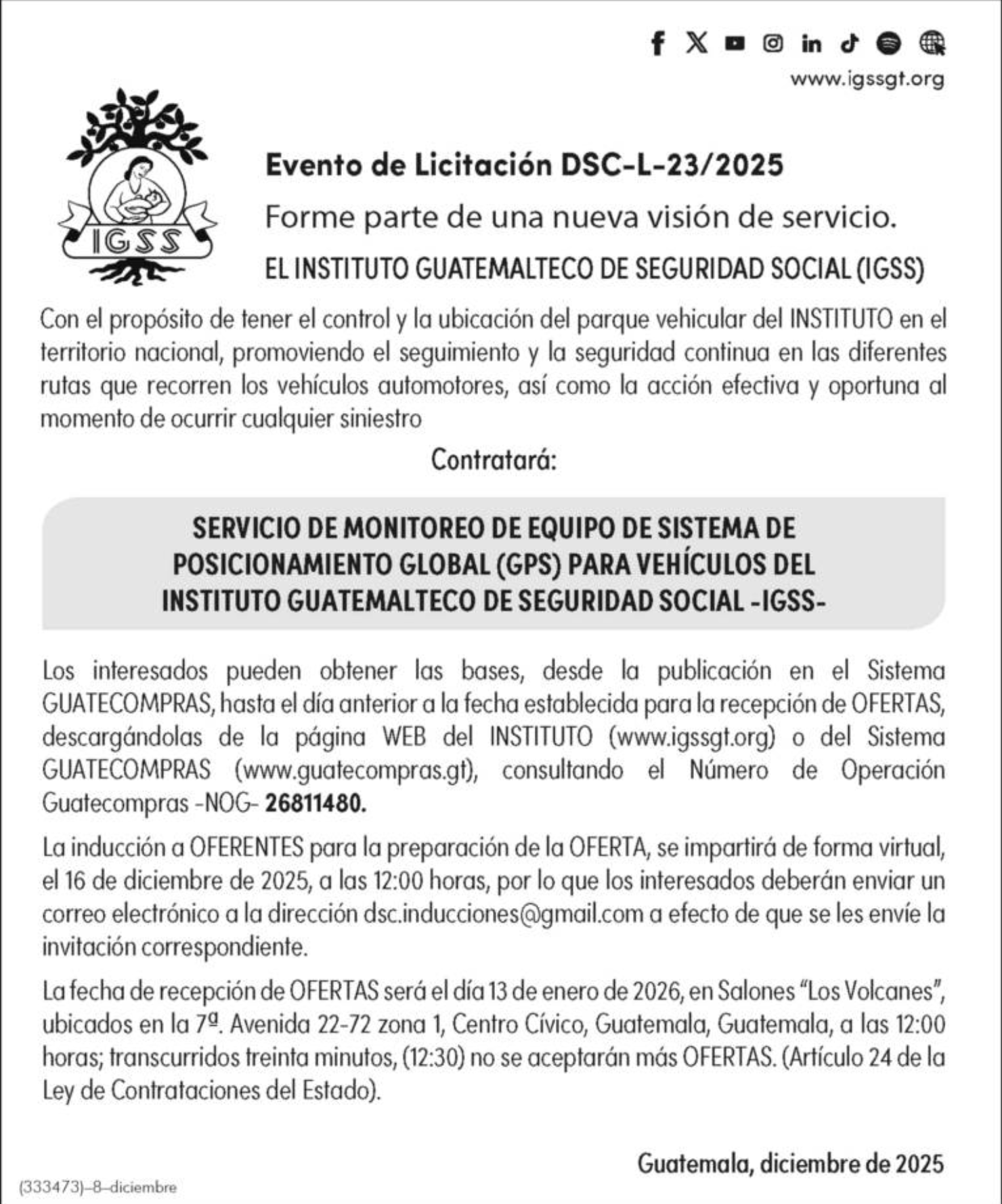 El Instituto Guatemalteco de Seguridad Social con el propósito de tener el control y la ubicación del parque vehicular del INSTITUTO en el territorio nacional, promoviendo el seguimiento y la seguridad continua en las diferentes rutas que recorren los vehículos automotores, así como la acción efectiva y oportuna al momento de ocurrir cualquier siniestro contratará:
