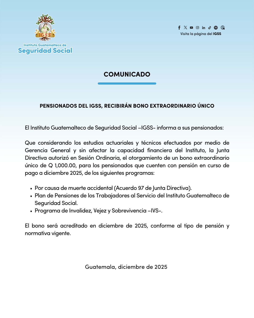 El Instituto Guatemalteco de Seguridad Social -IGSS- informa a sus pensionados: