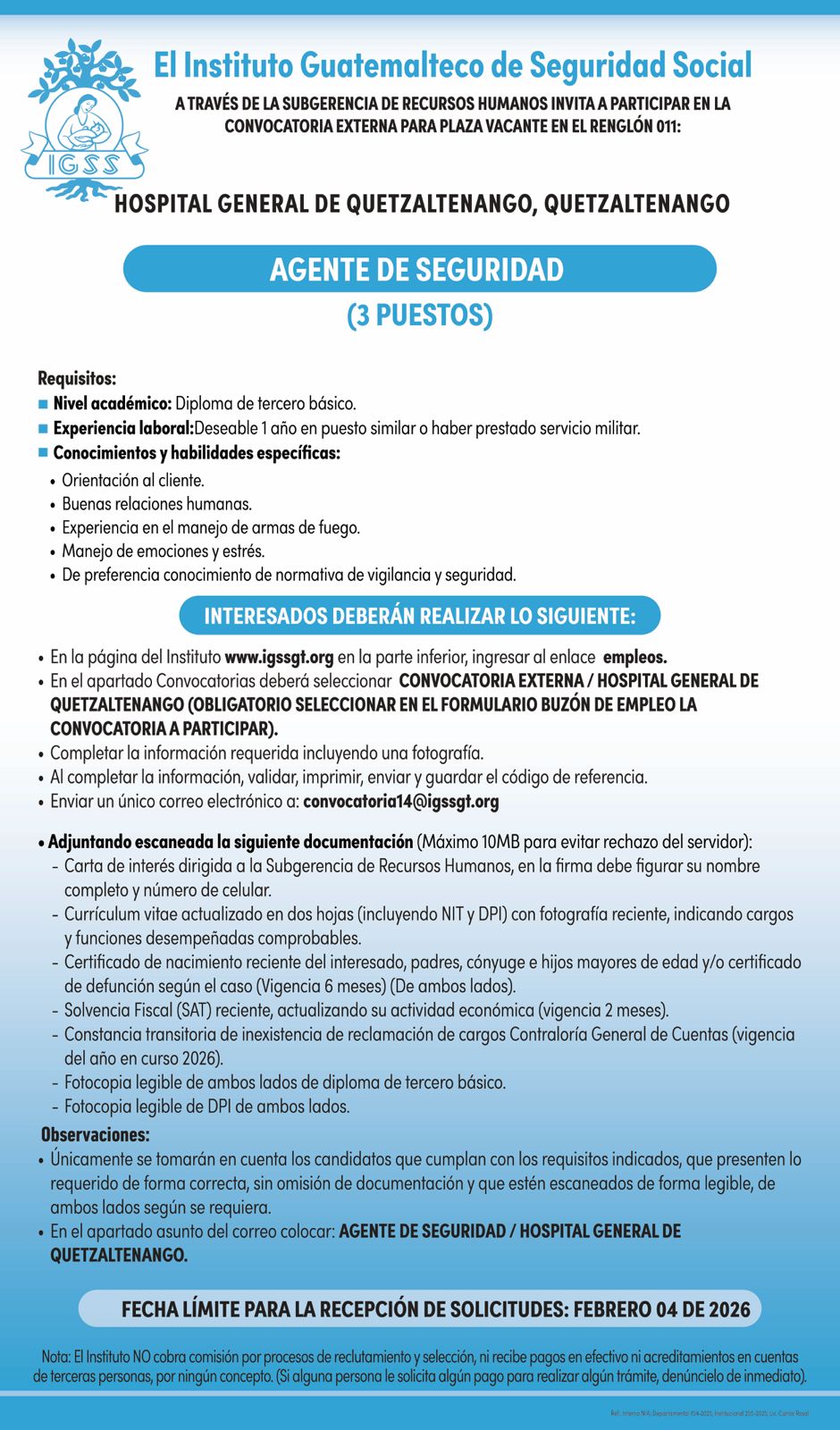 El Instituto Guatemalteco de Seguridad Social a través de la Subgerencia de Recursos Humanos invita a participar en la convocatoria externa para la plaza vacante 011: