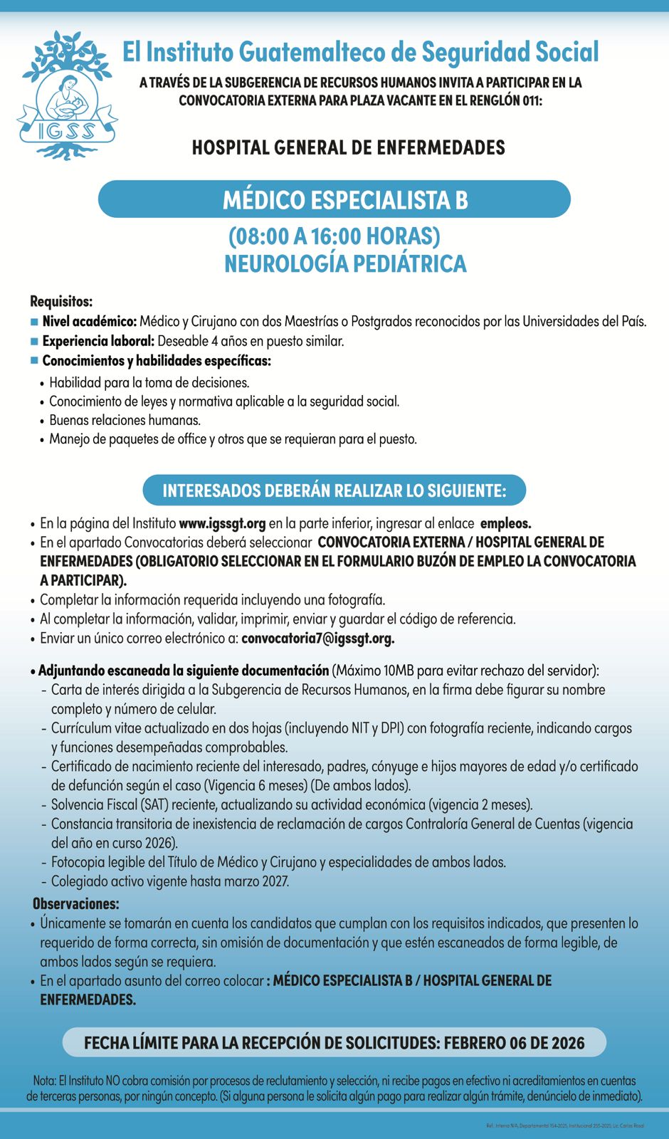 El Instituto Guatemalteco de Seguridad Social a través de la Subgerencia de Recursos Humanos invita a participar en la convocatoria externa para la plaza vacante 011: