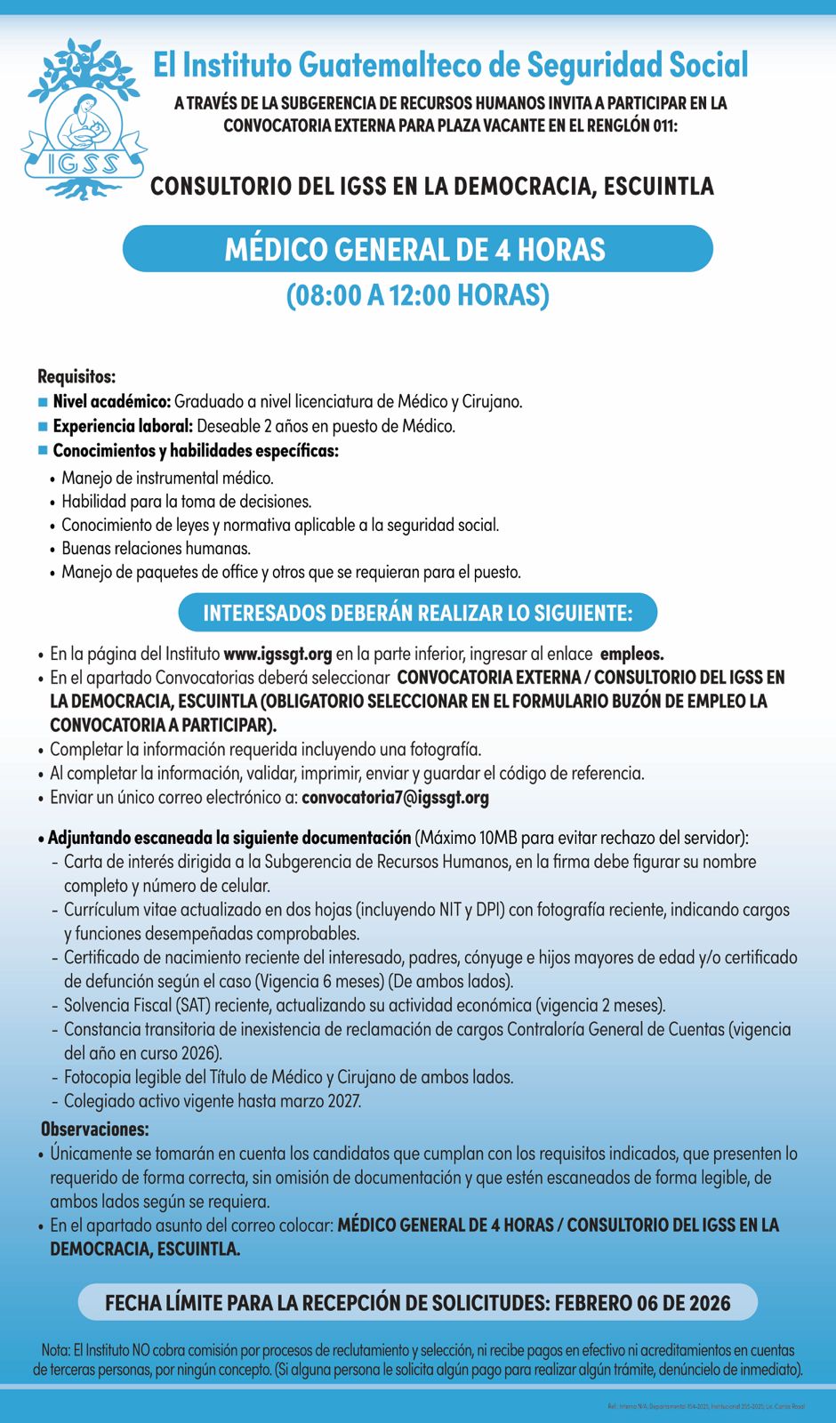 El Instituto Guatemalteco de Seguridad Social a través de la Subgerencia de Recursos Humanos invita a participar en la convocatoria externa para la plaza vacante 011: