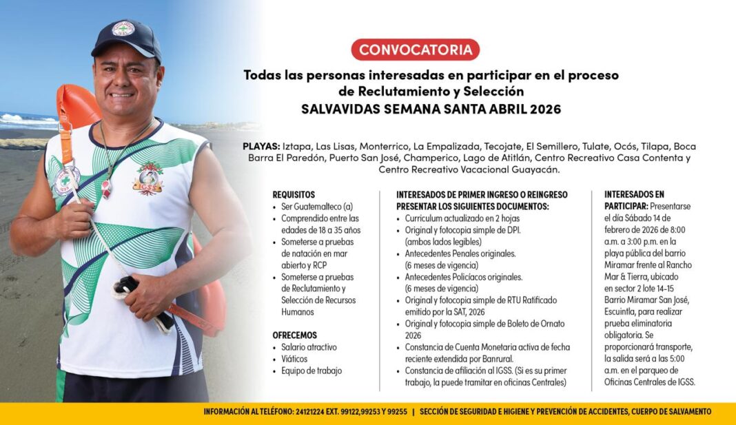 El Instituto Guatemalteco de Seguridad Social -IGSS- invita a todas las personas interesadas en participar en el proceso de Reclutamiento y Selección de Salvavidas, Semana Santa 2026.
