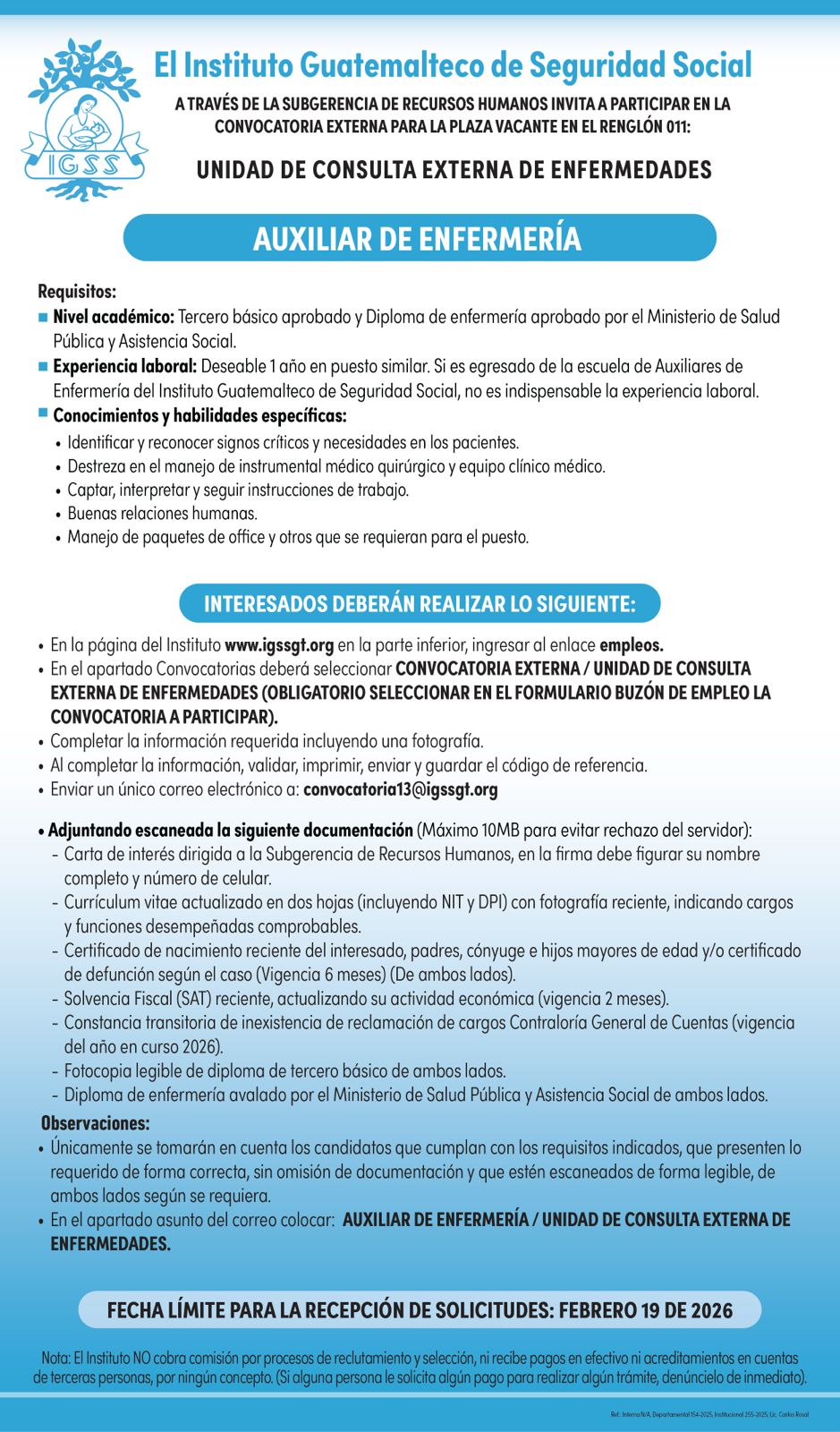 El Instituto Guatemalteco de Seguridad Social a través de la Subgerencia de Recursos Humanos invita a participar en la convocatoria externa para la plaza vacante 011: