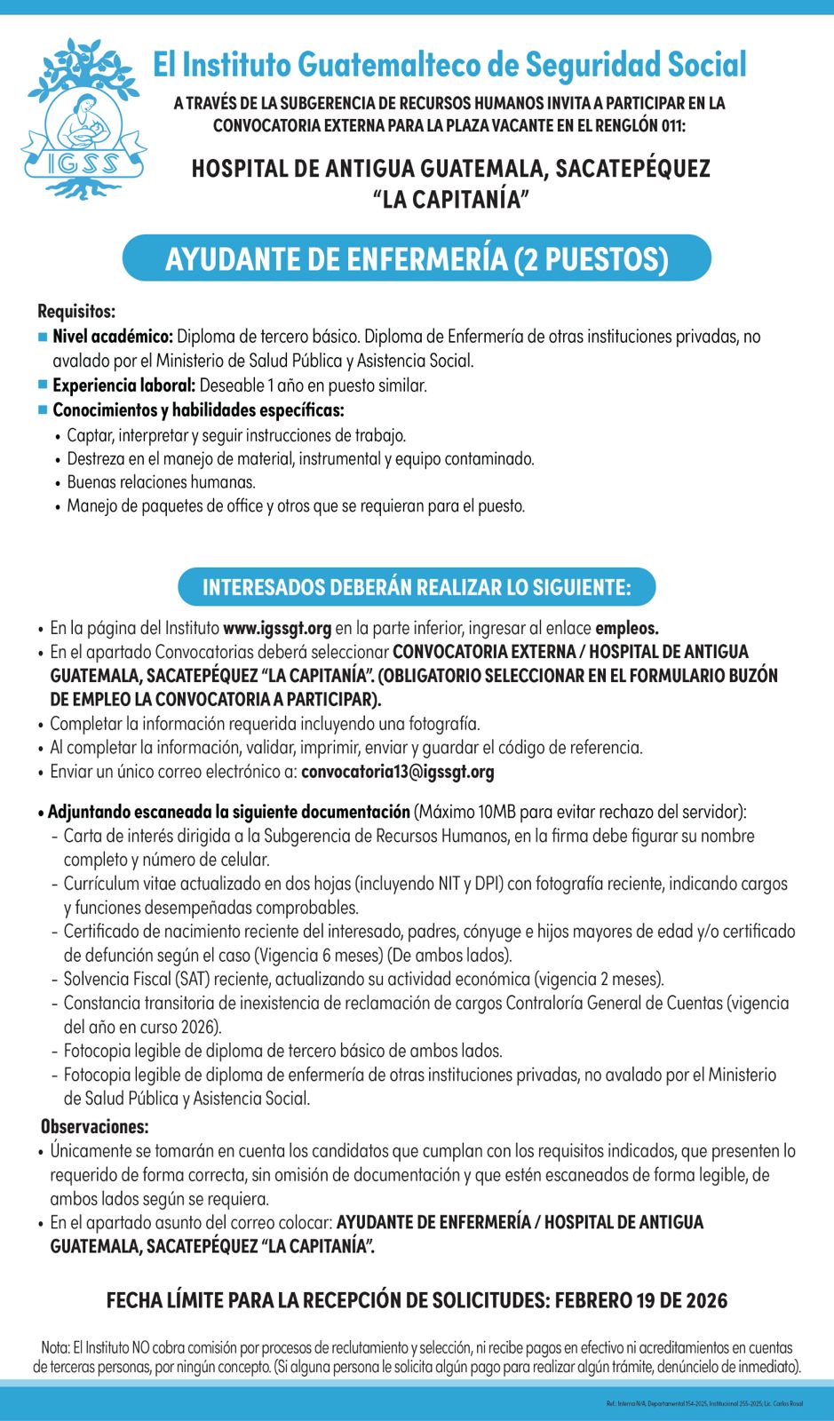 El Instituto Guatemalteco de Seguridad Social a través de la Subgerencia de Recursos Humanos invita a participar en la convocatoria externa para la plaza vacante 011: