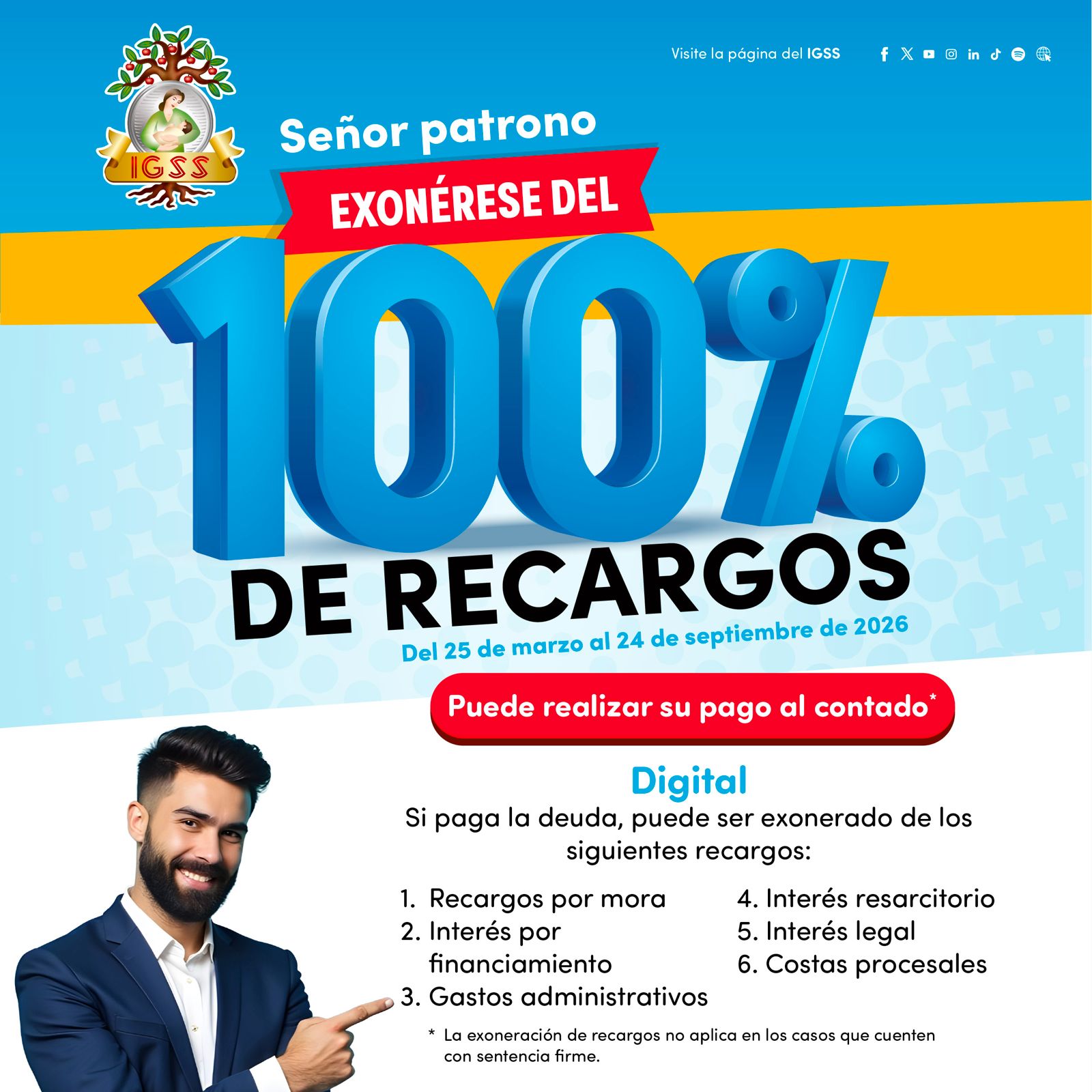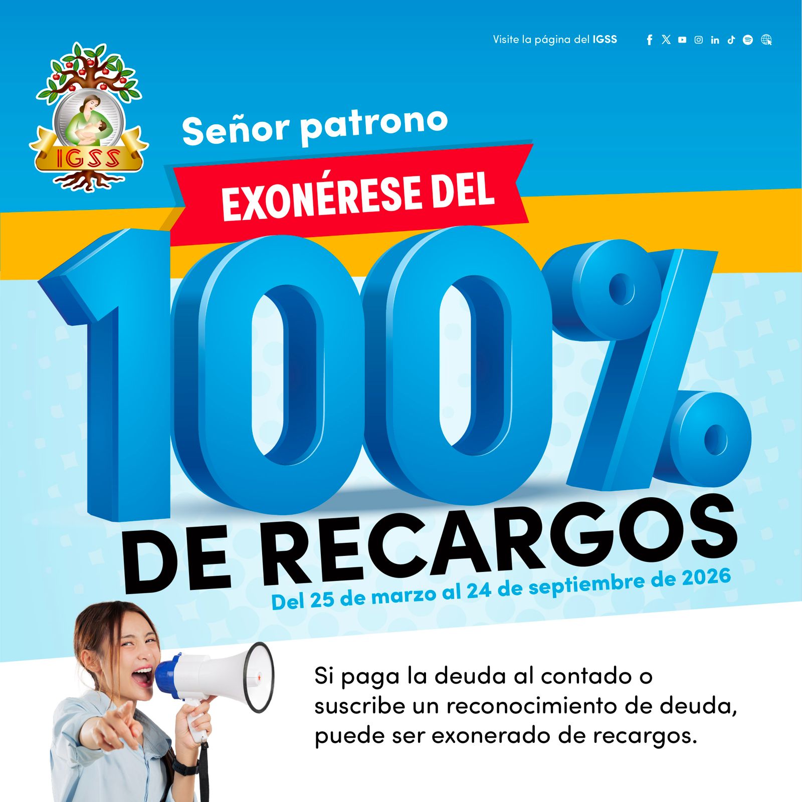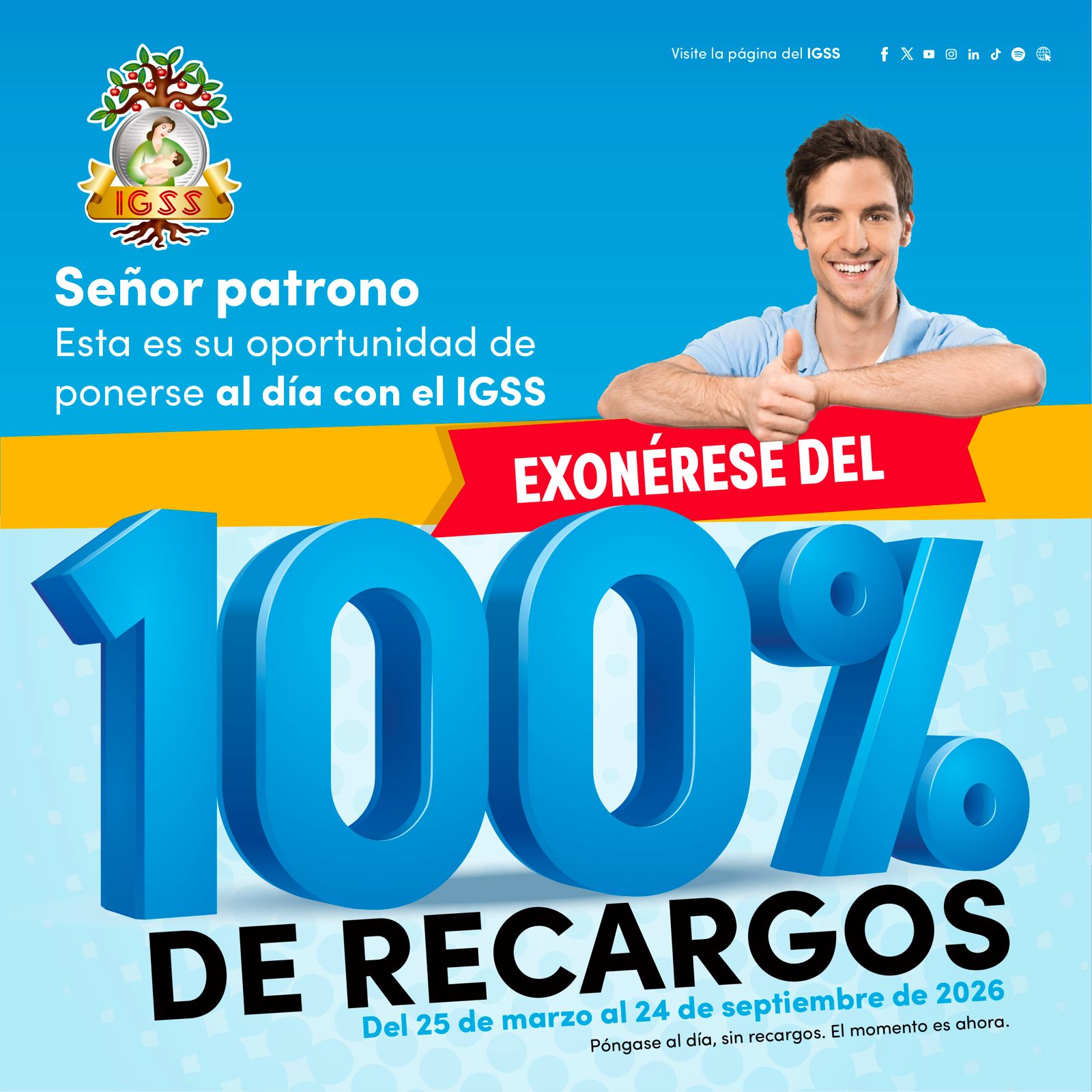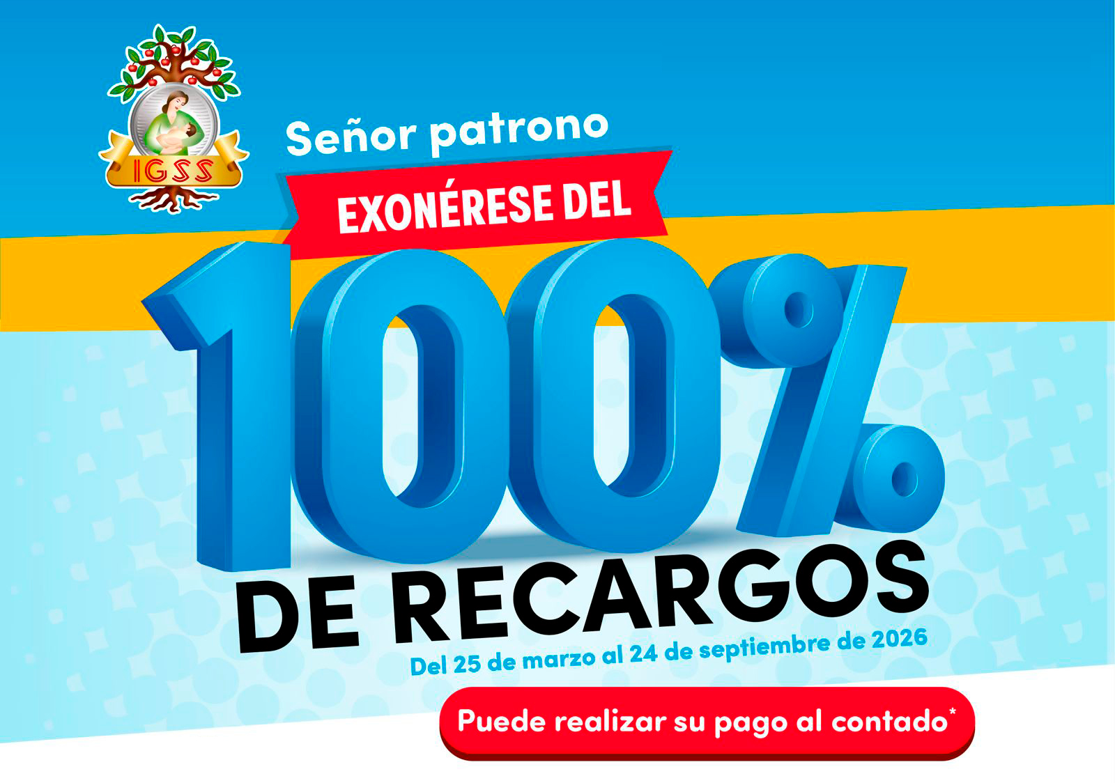 Señor patrono exonérese del 100% de recargos del 25 de marzo al 24 de septiembre de 2026. Esta es su oportunidad de ponerse al día con el IGSS.