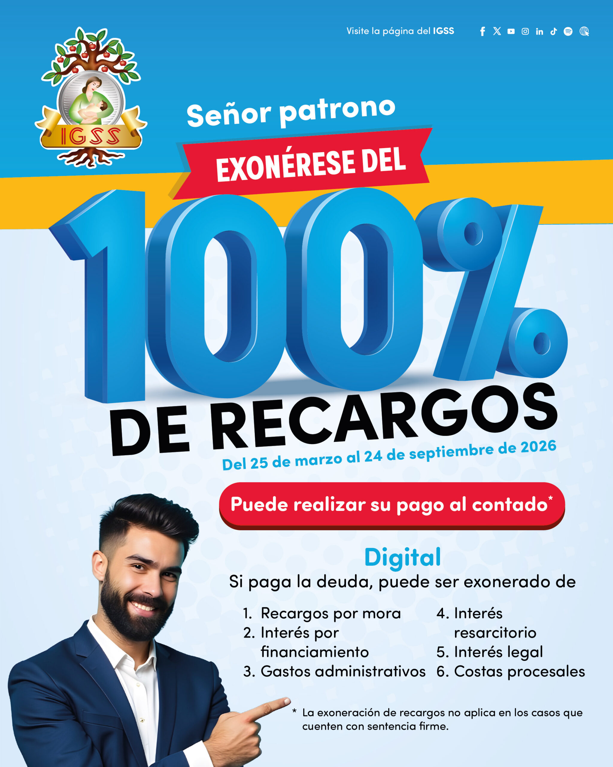 Señor patrono el Instituto pone a su disposición el beneficio de la exoneración de recargos, para que pueda regularizar su situación de deuda, para optar a este beneficio deberá cumplir con los Requisitos Generales y los adicionales según el caso: