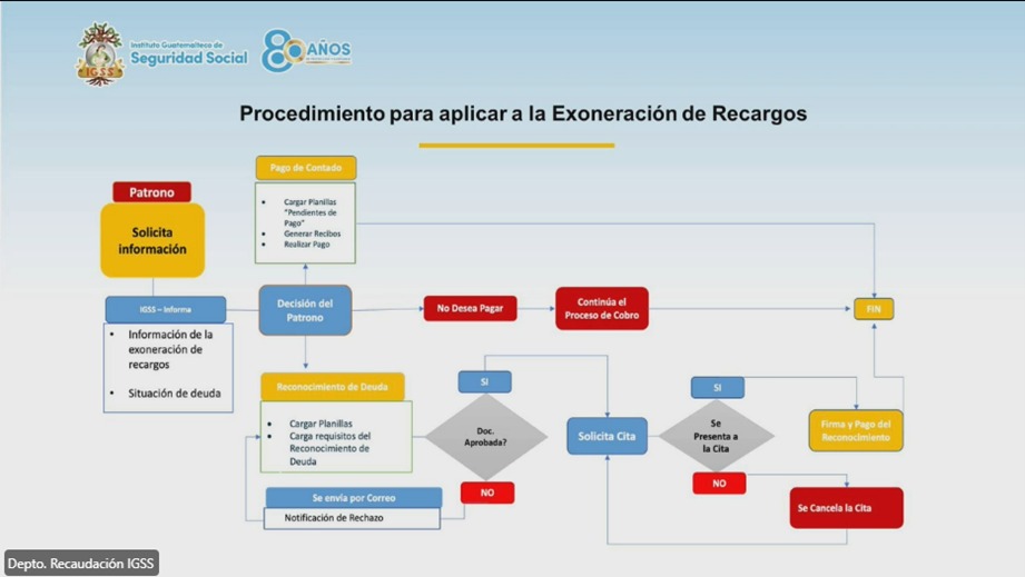 Del 25 de marzo al 24 de septiembre, estará vigente la exoneración de hasta el 100 % de recargos, durante este plazo los patronos podrán regularizar su situación cancelando la deuda total al contado o mediante la suscripción de un reconocimiento de deuda.