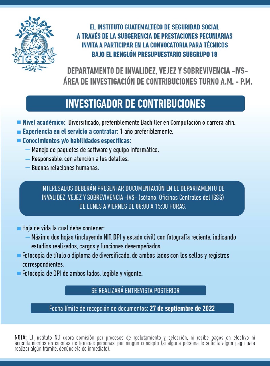 InicioConvocatoria plaza IGSS invstigador de contribuciones 2022